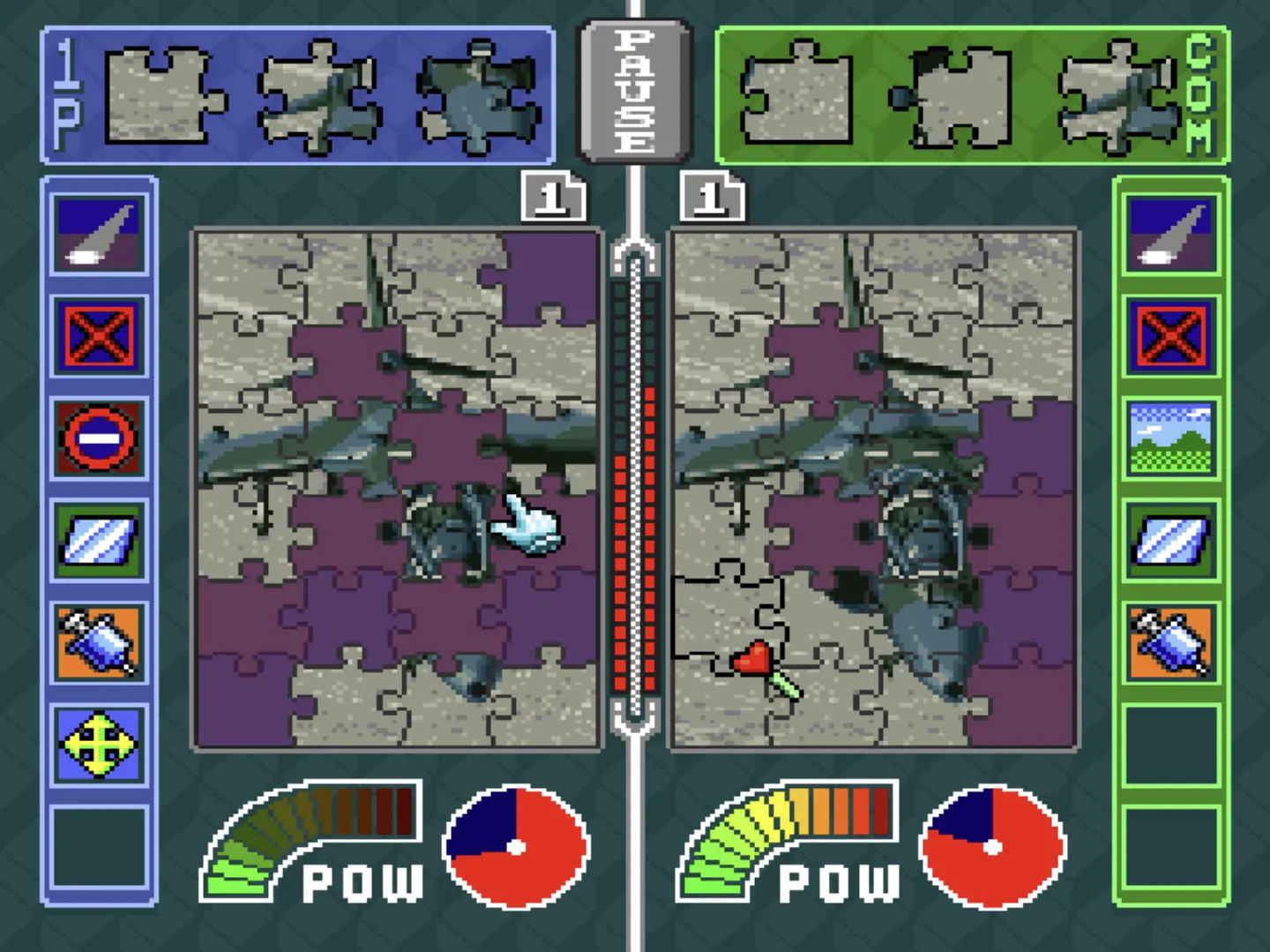 Pieces era, literalmente, un juego de puzles. Su particularidad radicaba en la idea de que competíamos con otro jugador – o CPU- para ver quién los terminaba antes. La mecánica estaba muy simplificada. Los puzles eran sencillos y no había que rotar las piezas. La verdadera diversión provenía de la competición, potenciada por las habilidades especiales. Cada jugador podía ganarlas al realizar combinaciones rápidas de aciertos. Estas ‘cartas’ servían para facilitarnos completar el puzle o para ponerle las cosas más difíciles al contrincante. Algunas nos guiaban donde poner la pieza o incluso la ponían automáticamente.Otras invertían los controles del oponente o le quitaban la energía para que no pudiera utilizar habilidades. Un título divertido en su modo historia, pero mucho más jugándolo con amigos.