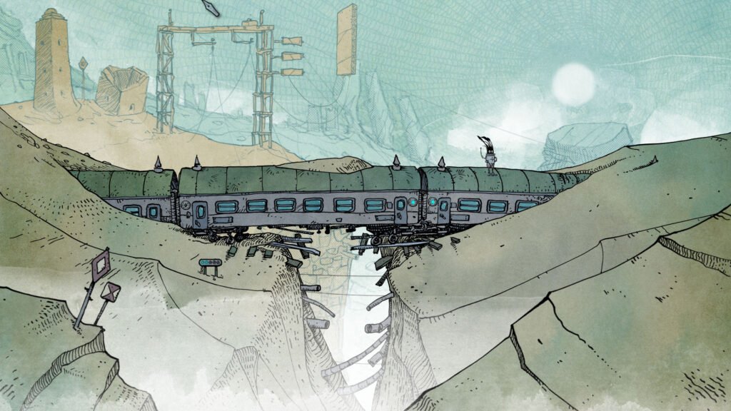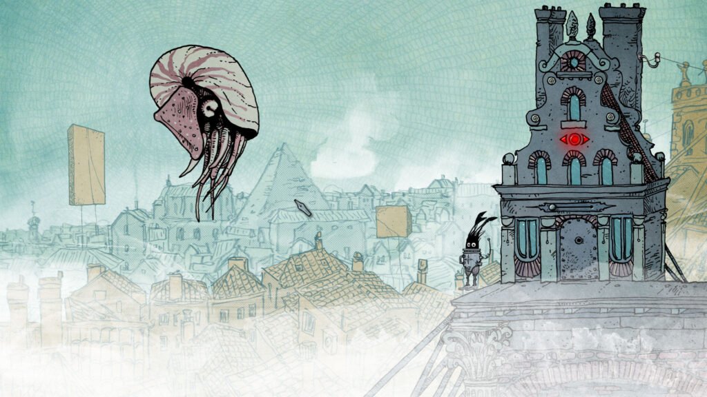 Cuando hablaba anteriormente de que Slice of Sea es un juego de exploración lenta, no solo era por sus mecánicas. Su apartado artístico invita a quedarte y observar su surrealista mundo donde hay extrañas criaturas que vuelan sin alas y construcciones que flotan sin motivo aparente. Los gráficos dibujados a mano son una maravilla. El nivel de detalle convierte cada escenario en una pequeña obra de arte. Todo está lleno de maquinaria antigua, viejas construcciones y un paraje desértico donde alguna vez hubo un mar. Puede parecer que el juego lleva implícito cierto mensaje ecologista pero su mensaje es mucho más profundo. Slice of Sea no te cuenta nada con palabras, pero deja entrever un mensaje que tiene relación con la necesidad de encajar y encontrar tu lugar en el mundo aunque todo haya cambiado y ese lugar ya no parezca existir. Este mundo le es tan ajeno a Seaweed que ninguno de los personajes con los que nos encontramos interactúa con nosotros. Es como si no existiésemos para ellos. Es una decisión de diseño para remarcar la soledad.
